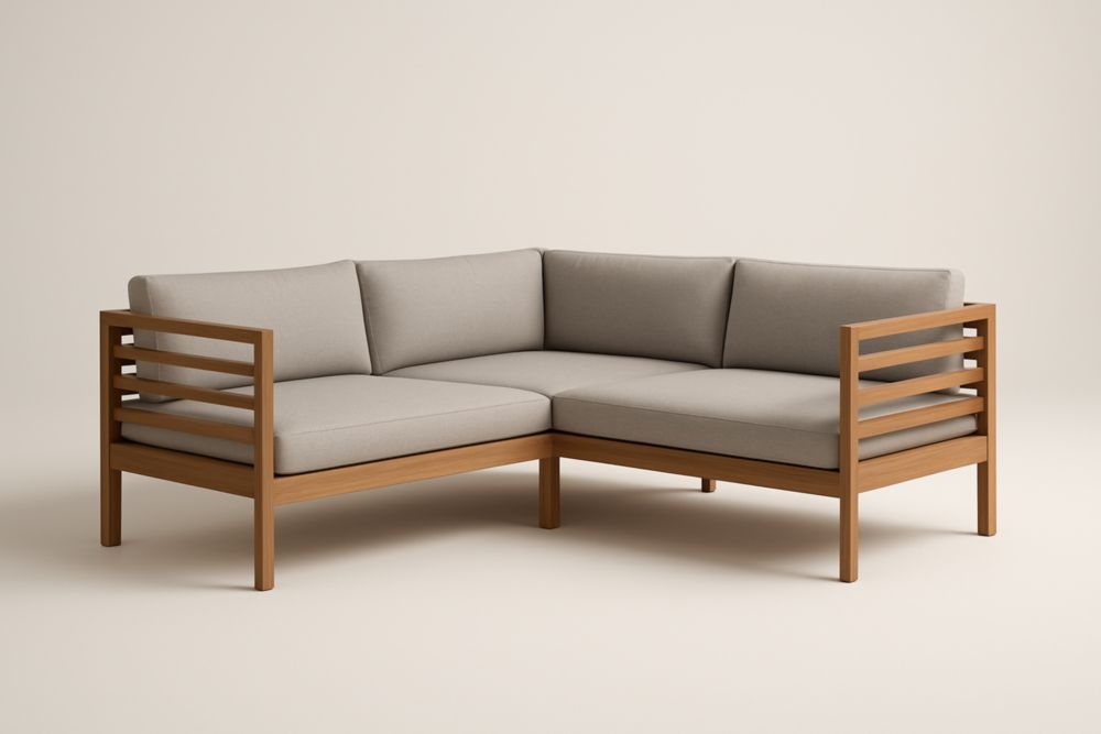 Divano angolare da giardino in legno di teak con cuscini in tessuto poliestere grigio