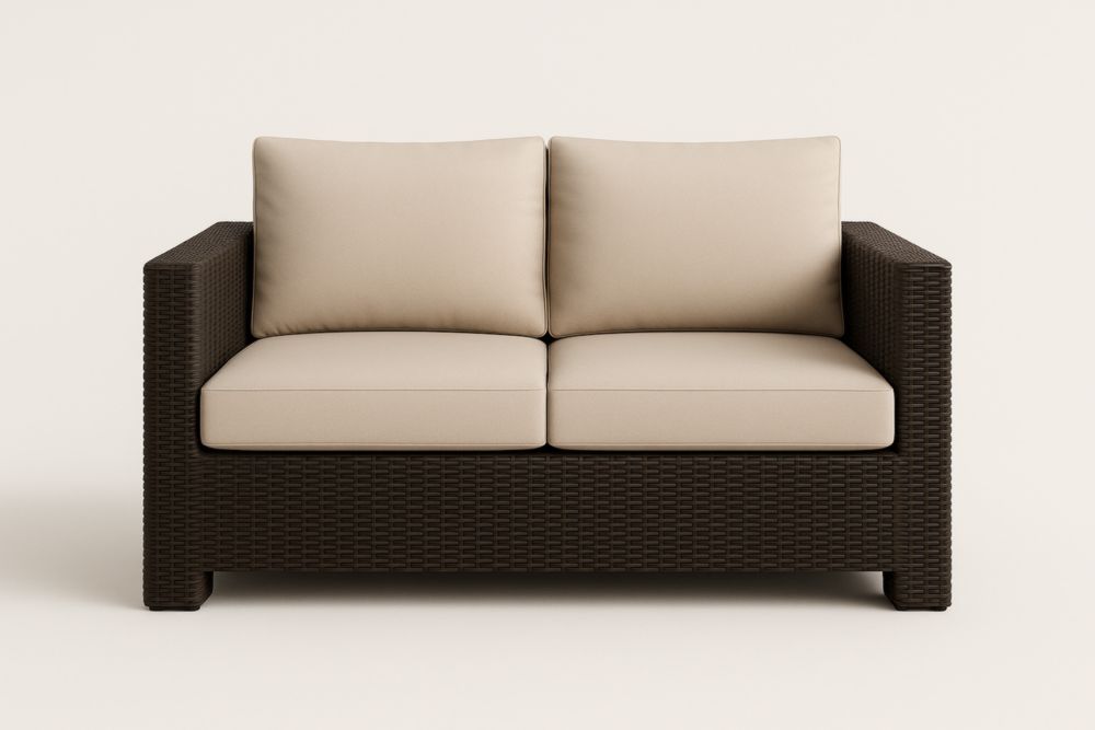 Divano da due posti da giardino in rattan sintetico marrone con cuscini in poliestere beige