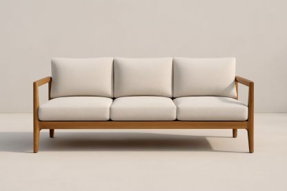 Divano da tre posti da giardino in legno massello con cuscini in tessuto poliestere beige